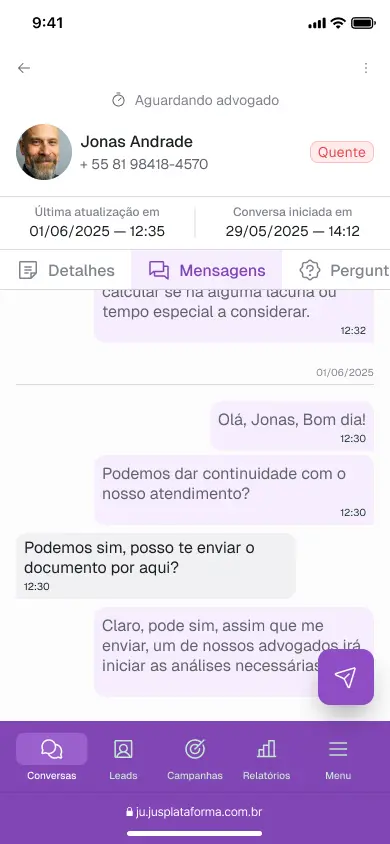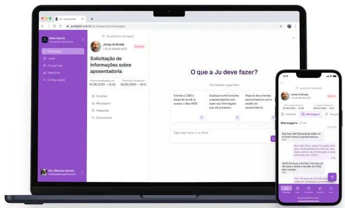 A Ju dá o retorno, negocia, acompanha e ainda conversa com você pra te atualizar e receber orientações caso necessário. Menos tempo no whatsapp, mais tempo no Direito.